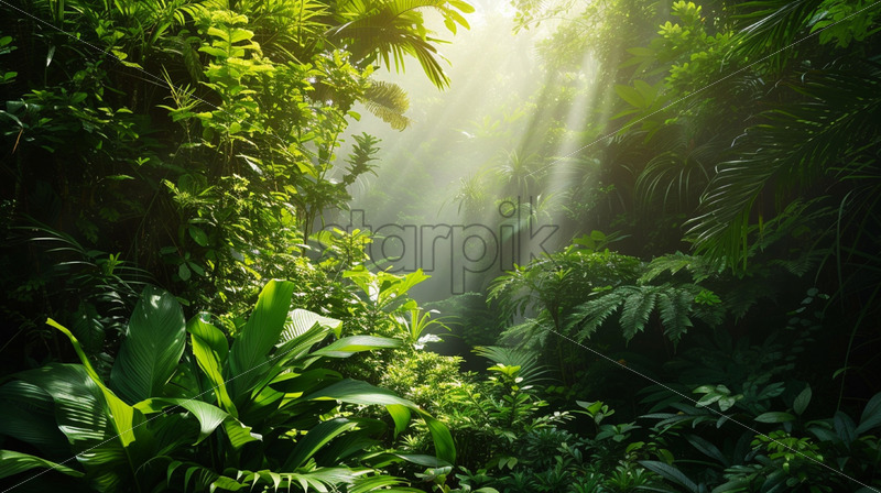 A dense jungle canopy with vibrant and varied flora, hiding mysterious creatures within its shadows