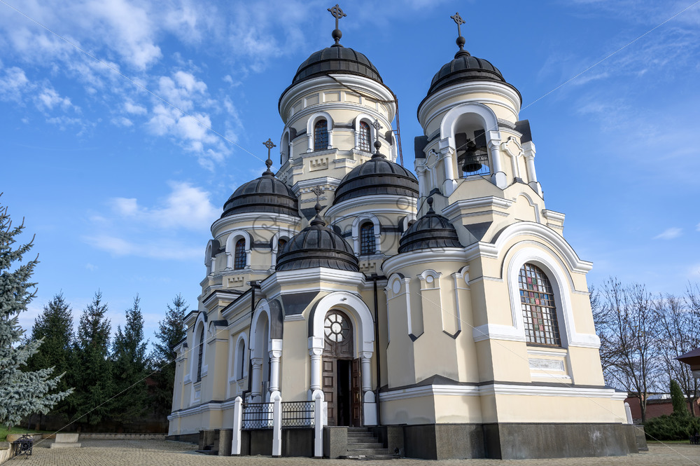 The Winter Church and inner court of the Capriana monastery. Bare trees, good weather in Moldova
