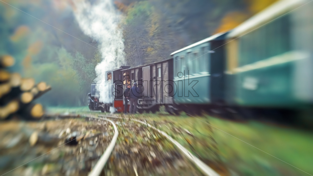 Moving steam train Mocanita with passengers inside, Romania. Lensbaby effect