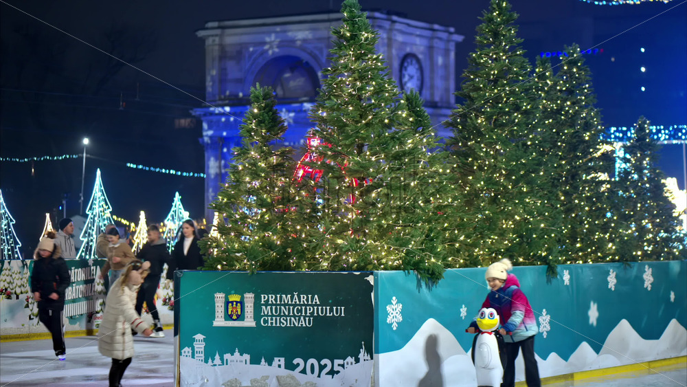 Video Chisinau, Moldova – December 24, 2024: People ice skating at the Christmas Market in the evening Royalty Free Stock Video Footage