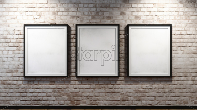 Three paintings on a brick wall