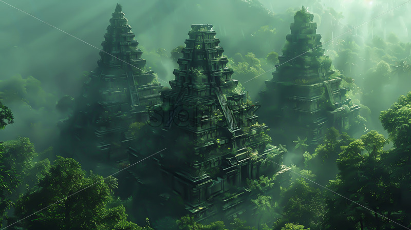 An ancient, moss-covered ruin peeking through the thick vegetation