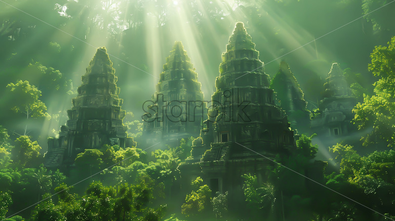 An ancient, moss-covered ruin peeking through the thick vegetation