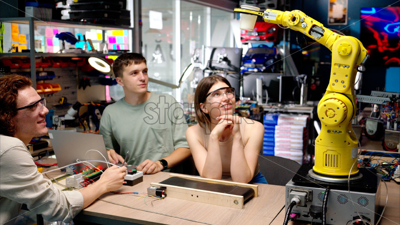 Three young happy engineers fixing an yellow robotic arm in the workshop, computer programming