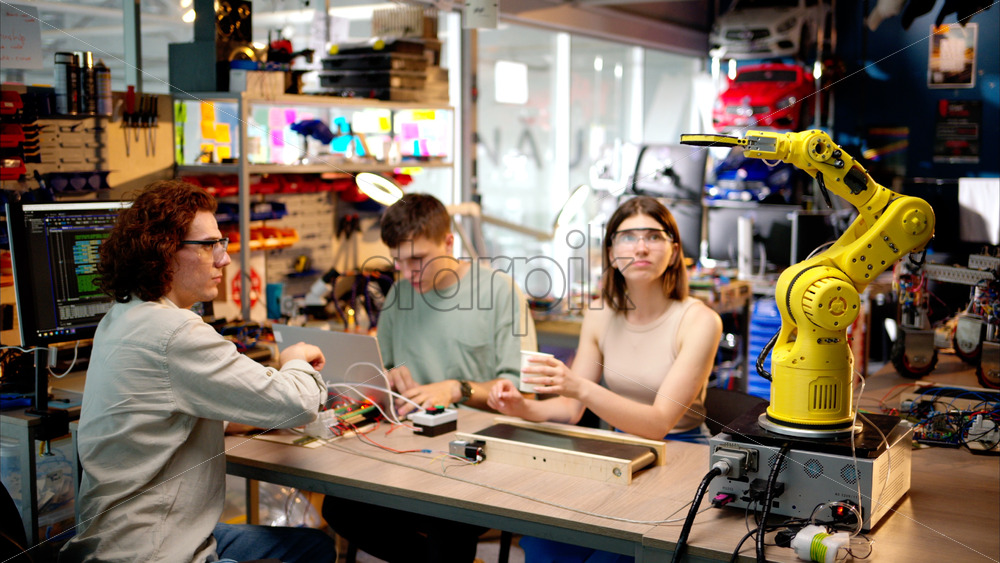 Three young happy engineers fixing an yellow robotic arm in the workshop, computer programming