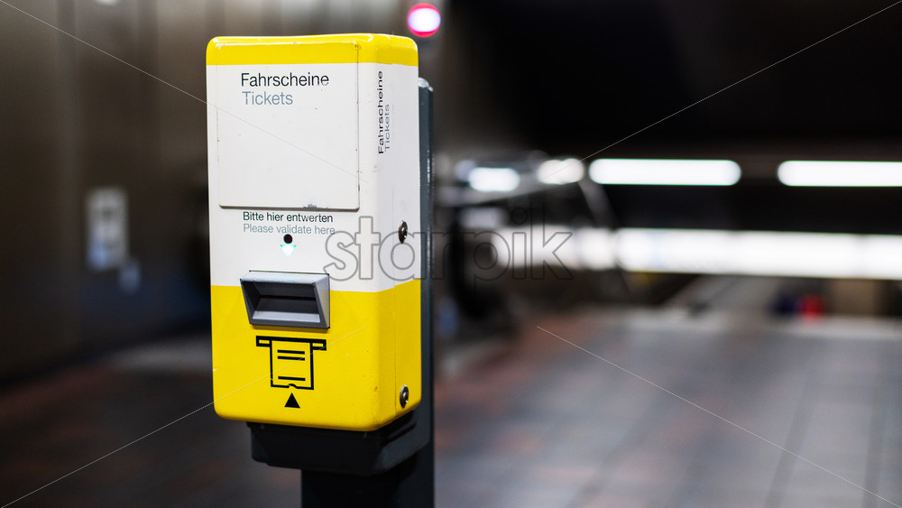 Close-up view of a ticket machine in the Berlin underground, Germany. Station on the background