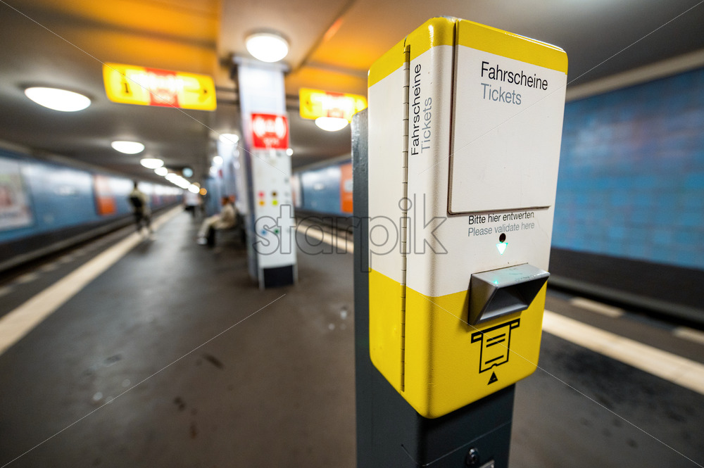 Ticket machine in the Berlin underground, Germany. People at the station on the background