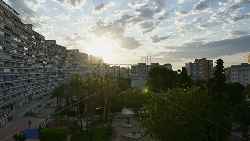 Time lapse of clouds moving above apartment blocks and a green urban park in Alicante, Spain Royalty Free Stock Video Footage