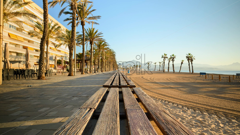 Time lapse of people walking on a palm tree lined promenade near the beach at sunrise in Alicante, Spain Royalty Free Stock Video Footage