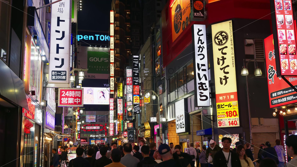 Tokyo, Japan – April 12, 2025: View of the vibrant life of Shinjuku City with people moving on the streets with lighted buildings in the evening. Translation: “Company names” Royalty Free Stock Video Footage