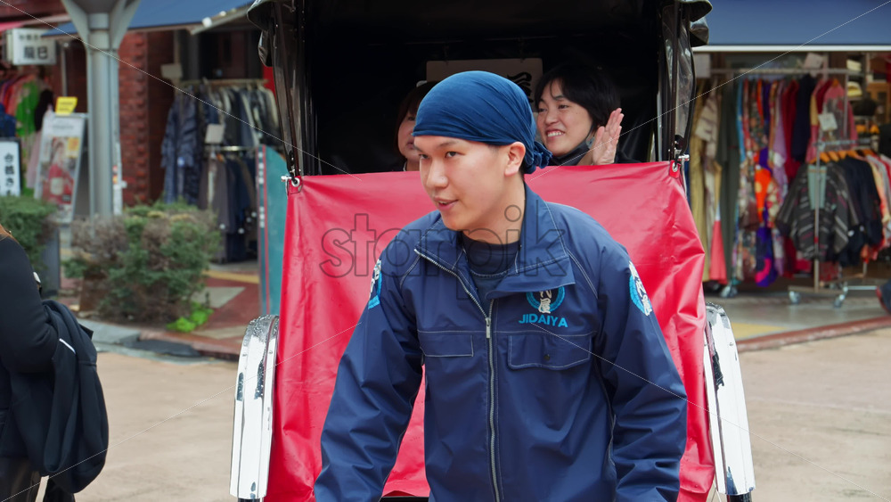 Tokyo, Japan – April 13, 2025: Two tourists riding in a rickshaw, smiling and waving near the Senso-ji temple in Asakusa Royalty Free Stock Video Footage