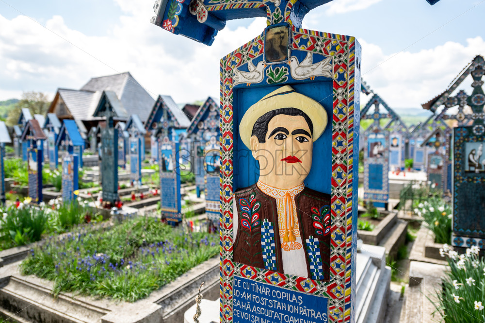 SAPANTA, ROMANIA – MAY, 2022: View of a tombstone at the Merry Cemetery
