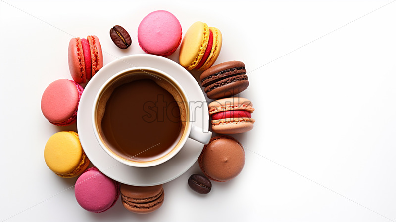 Colorful macarons and coffee cup, on wood table with Eiffel Tower on backgound