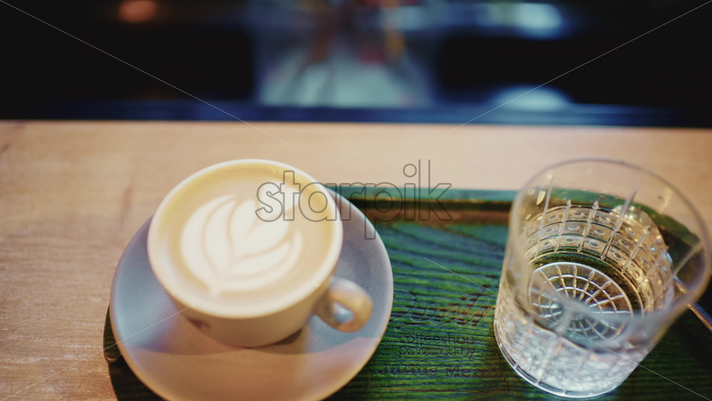 Top view of a latte with milk foam art served alongside a glass of water on a wooden tray