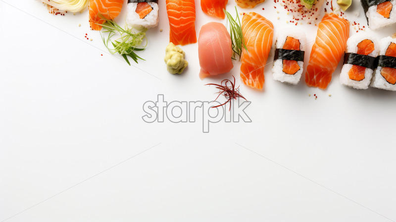 Home » Shop » Uncategorised » Top view sushi ingredients, on isolated white background