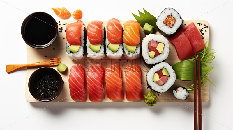 A captivating top-view photograph showcasing the elegance of Japanese sushi, featuring vinegared rice adorned with a medley of ingredients like fish, vegetables, and tropical fruits. The meticulous arrangement is presented on traditional Japanese dishware with gracefully placed chopsticks, set against … Read More