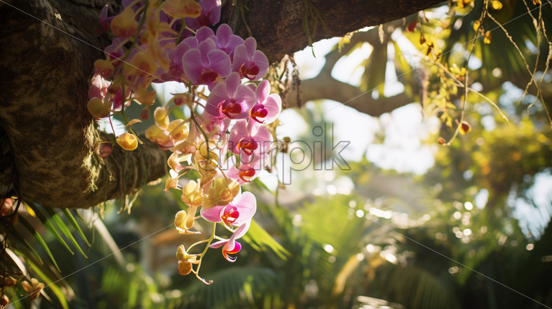 Home » Shop » Uncategorised » Towering tropical tree with vibrant orchids and epiphytes clinging to its majestic branches