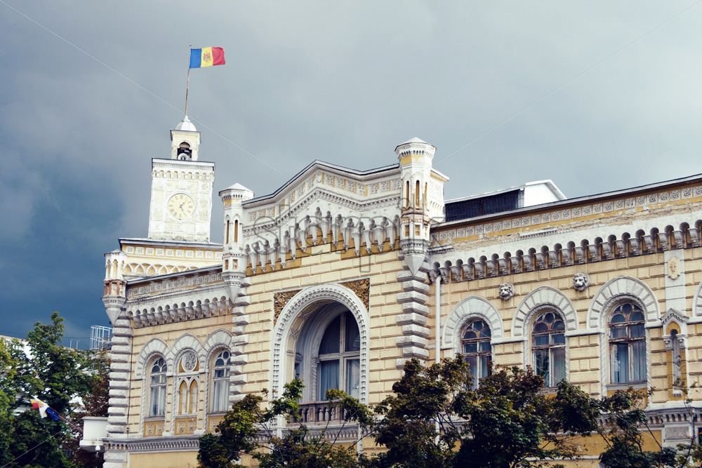 Town hall building on Stefan cel Mare street in Chisinau, Moldova, dark rainy sky