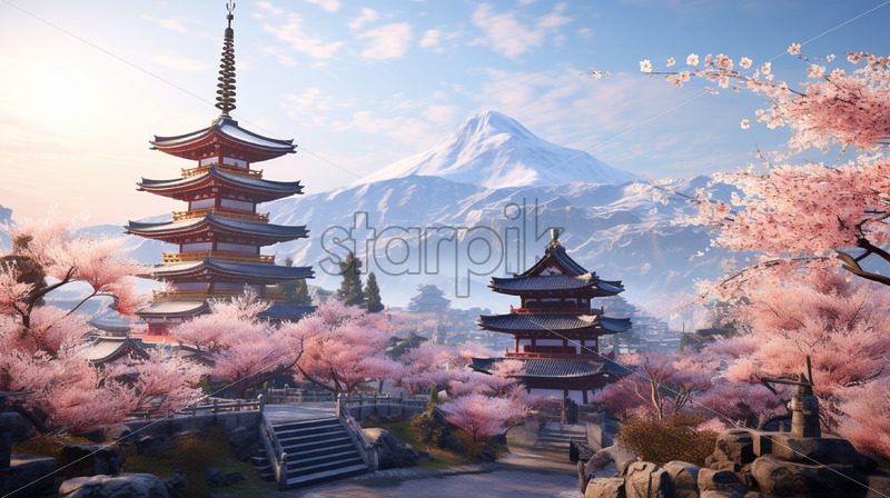 Traditional Asian architecture, pagodas, cherry blossoms