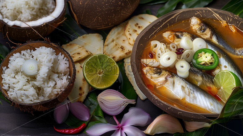 A traditional fish soup served with rice, lime, chili, onions, and flatbread.