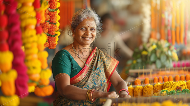 Indian saree weaver immersed in the artistry of weaving a colorful saree within the setting of a traditional workshop.