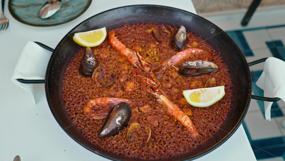 Traditional seafood paella served in a black paellera pan, garnished with lemon wedges, prawns, mussels and clams Royalty Free Stock Video Footage