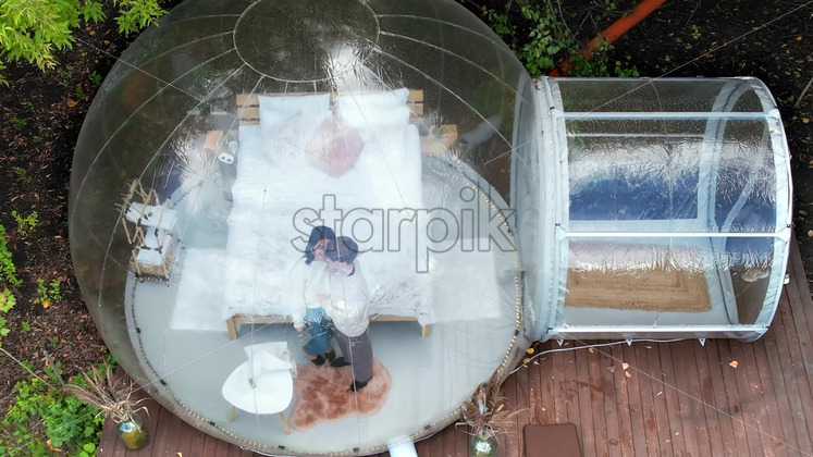 Transparent bubble tent at glamping, Lush forest around and interior. A couple hugging each other and talking