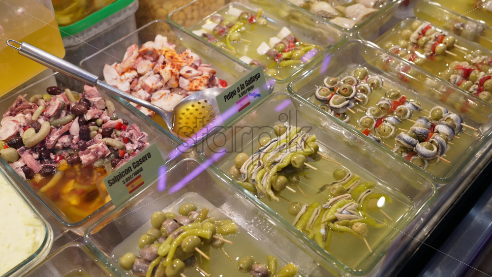Trays of tapas salads and olives, serving spoons resting on pans at the Central Market of Valencia, Spain Royalty Free Stock Video Footage