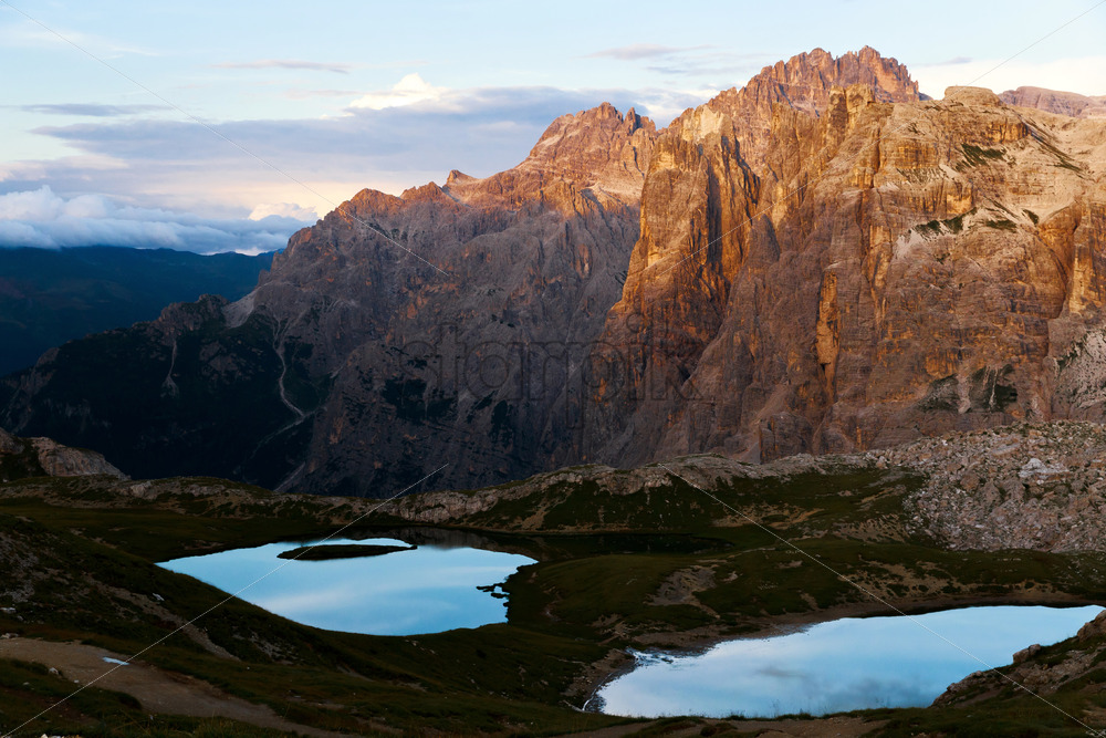 Tre Cime di Lavaredo peak and lakes in Dolomites Apls in Italy