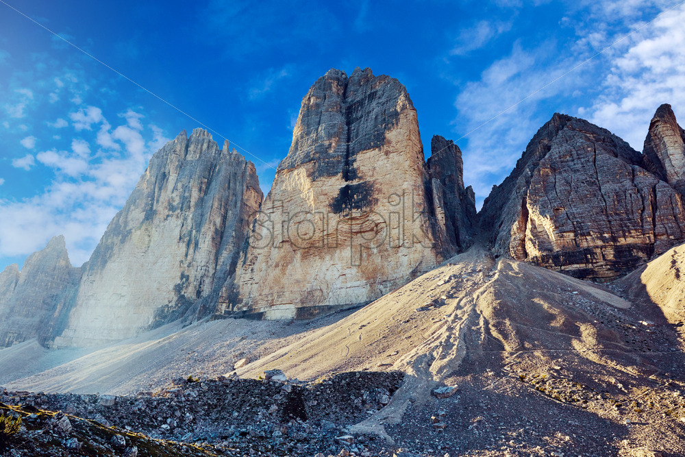 Tre Cime di Lavaredo mountains at daylight. Blue sky with clouds on background. Italy beauties