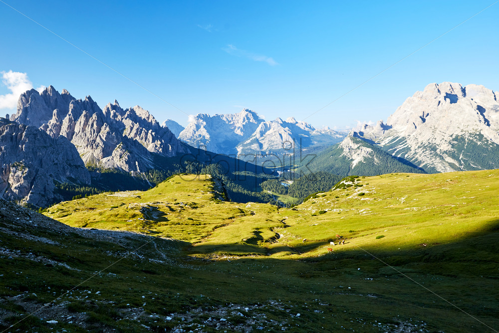 Dolomite Alps in Italy. View of mountains and greenery on slopes