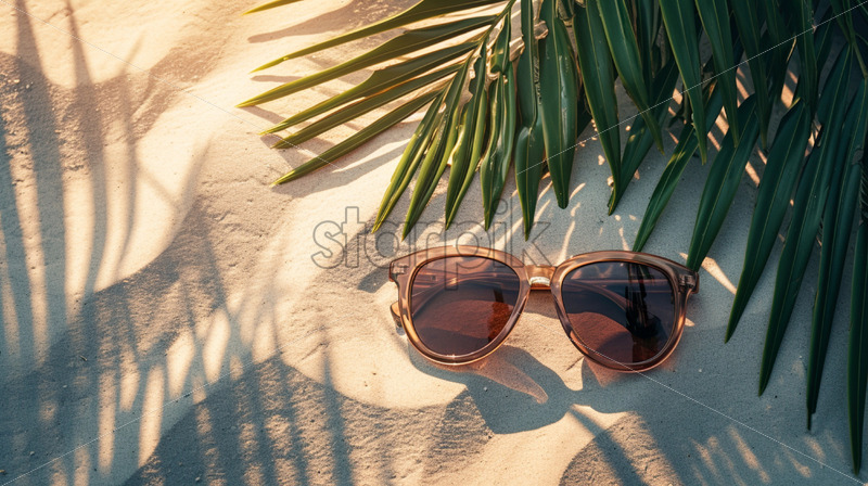 Home » Shop » Uncategorised » Trendy sunglasses on beach with green palm leaves