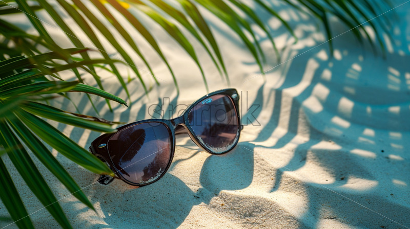 Home » Shop » Uncategorised » Trendy sunglasses on beach with green palm leaves