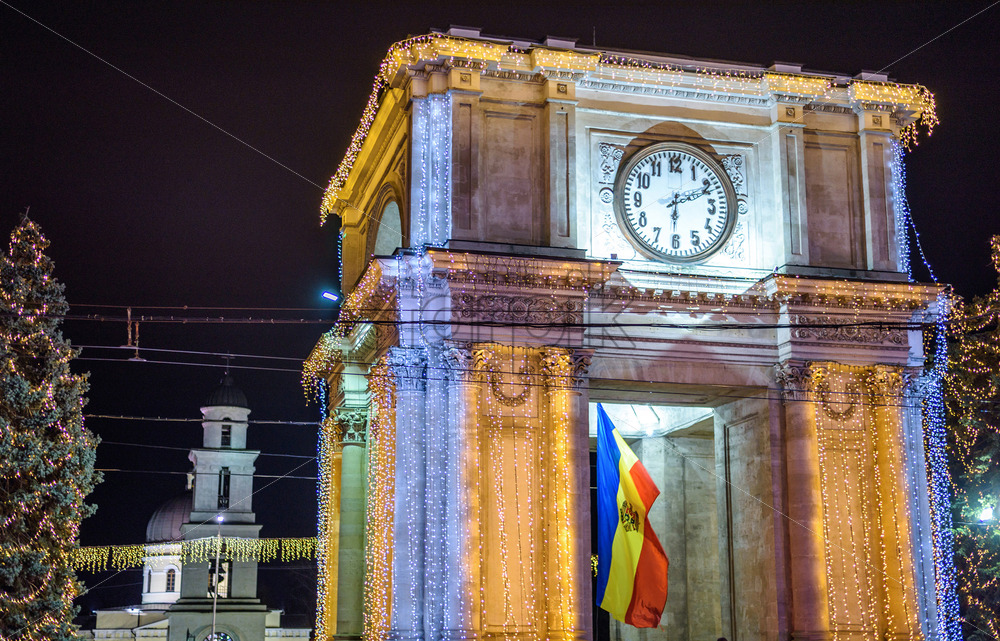 Aerial drone view of Chisinau city center covered in snow at night. The Triumphal Arch surrounded by Christmas winter decorations. Moldova Royalty Free Stock Video Footage