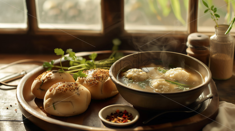 A bowl of Soto placed on a rustic wooden tray, accompanied by baked bread rolls and a small dish of chili flakes.