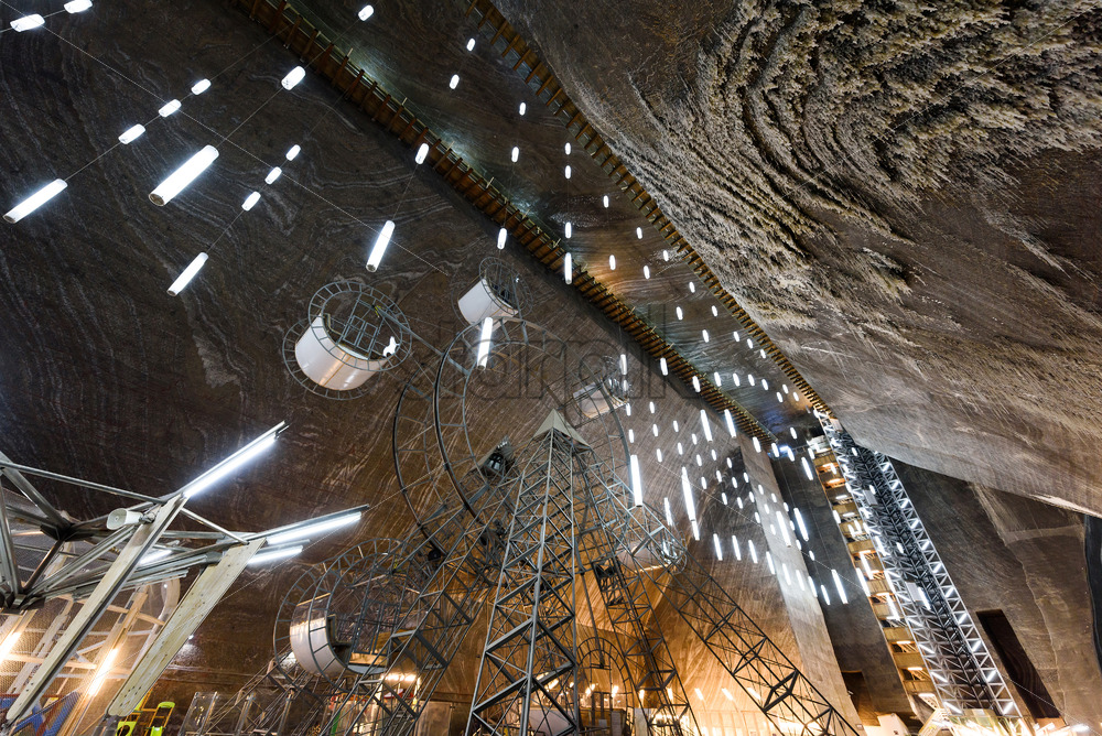 Turda, Romania – July 20, 2025: Large wooden extraction machinery displayed inside the Turda salt mine, with tourists walking around Royalty Free Stock Video Footage