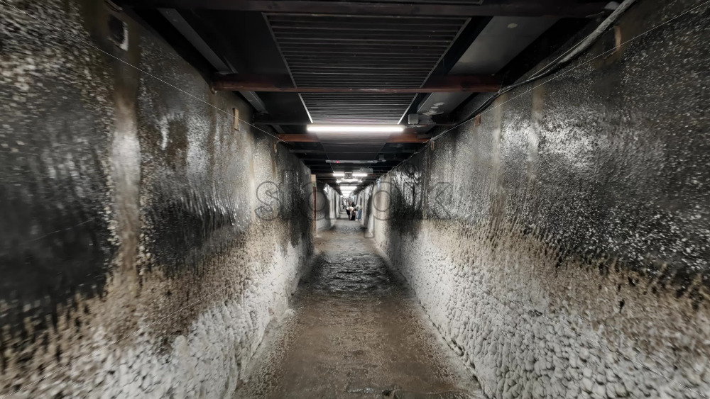 Turda, Romania – July 20, 2025: A narrow, illuminated tunnel inside the Turda Salt Mine with directional signage for visitors. Translation: “Direction signs and location names” Royalty Free Stock Video Footage