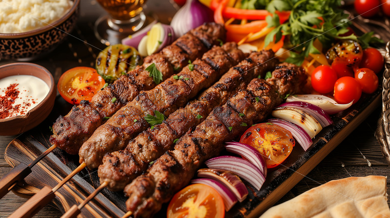 A mouthwatering image featuring Turkish Adana Kebab, spiced and grilled minced meat on skewers.