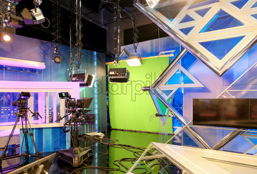 TV broadcasting studio with light equipment, green chroma and cameras ready for recordings Royalty Free Stock photo
