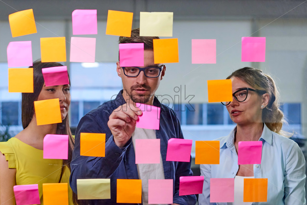Two caucasian mature women and a man discussing ideas on stickers in the office. View through window Royalty Free Stock photo