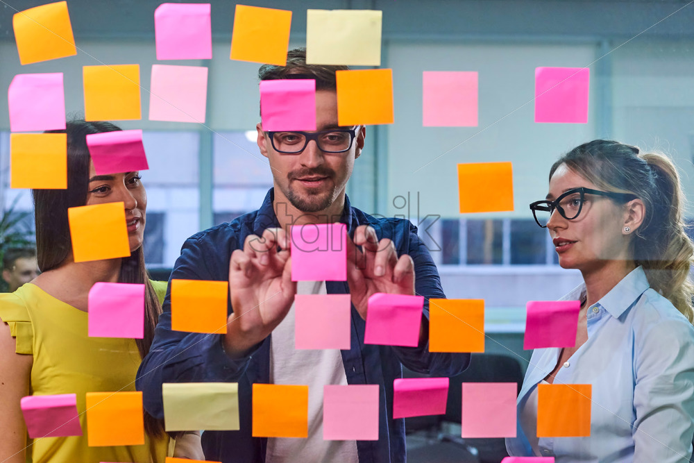 Two caucasian mature women and a man discussing ideas on stickers in the office. View through window Royalty Free Stock photo