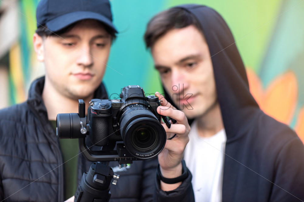 Two caucasian men looking into the camera screen on a steadicam, colored background