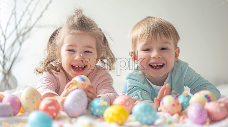 Two happy children are cracking pastel easter eggs