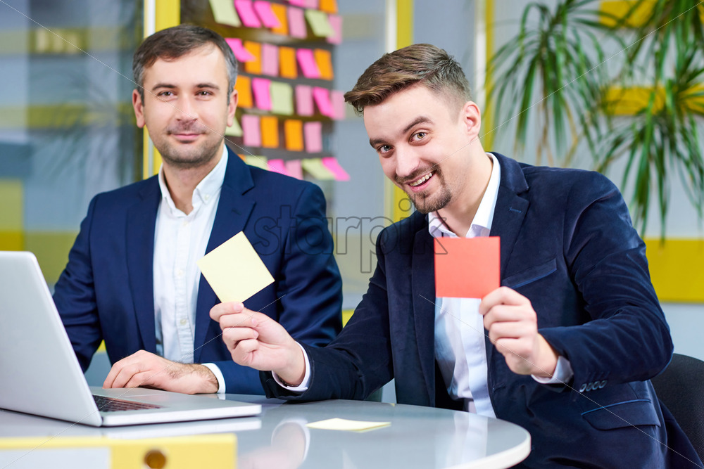 Two mature caucasian male having fun in the office with stickers. Wearing formal clothes. Royalty Free Stock photo