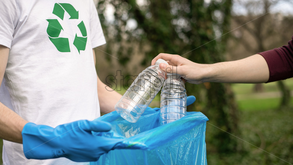 Two men collecting plastic garbage in bag in a polluted park. Rubber gloves, recycling sign on T-shirt