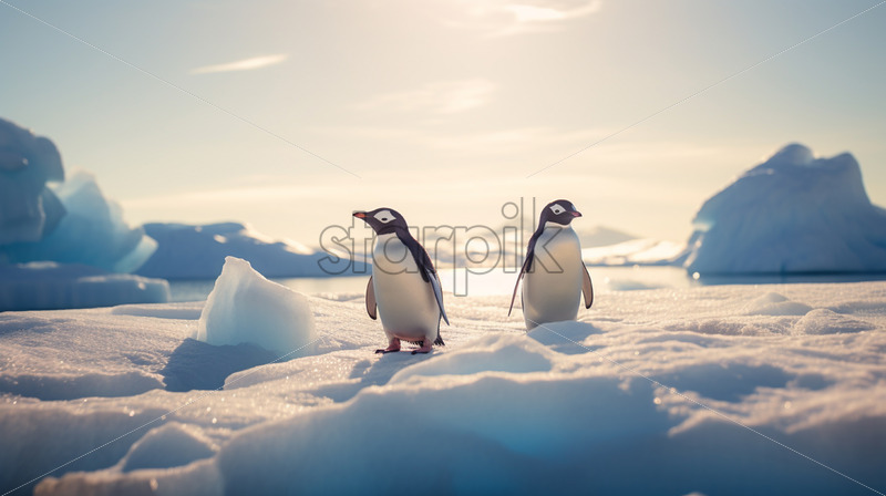 Two penguins sitting on icebergs in polar regions