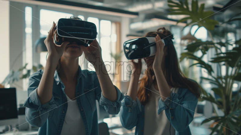 Two people playing with VR glasses in an office