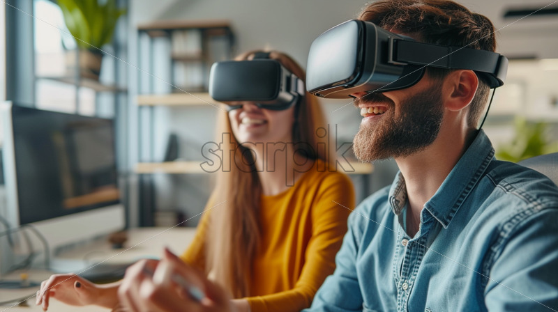 Business conference in VR in an office. Multiracial group of people using VR glasses and controllers