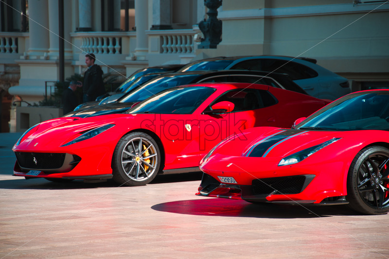 Monte Carlo, Monaco – March 8, 2024 : Two red Ferrari cars on the street standing next to each other