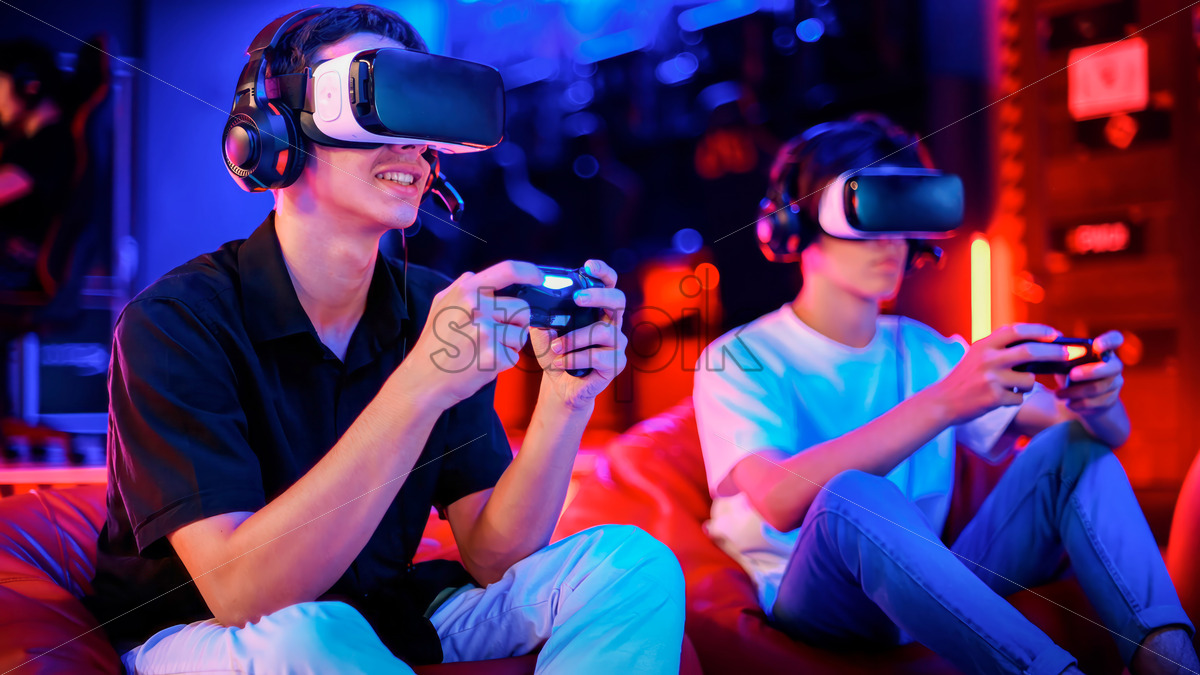 Home » Shop » people » Two teen friends are playing a game console in VR headset and headphones using gamepads and smiling while sitting on bean bags. Blue and red illumination